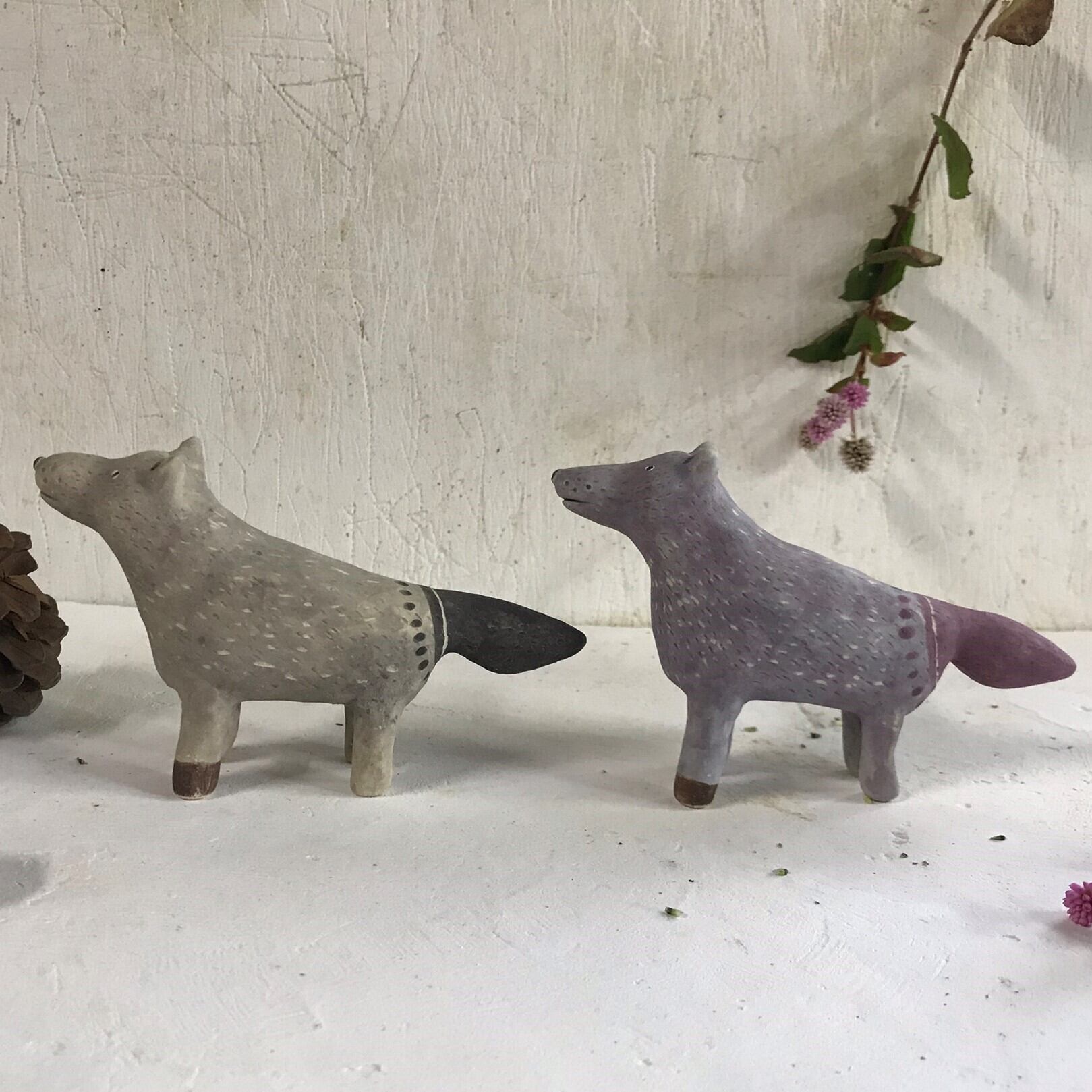 陶製のおおかみの置物です。手作りの為、1点1点 形、色などが画像と多少違いがあります。 長さ 12cm位