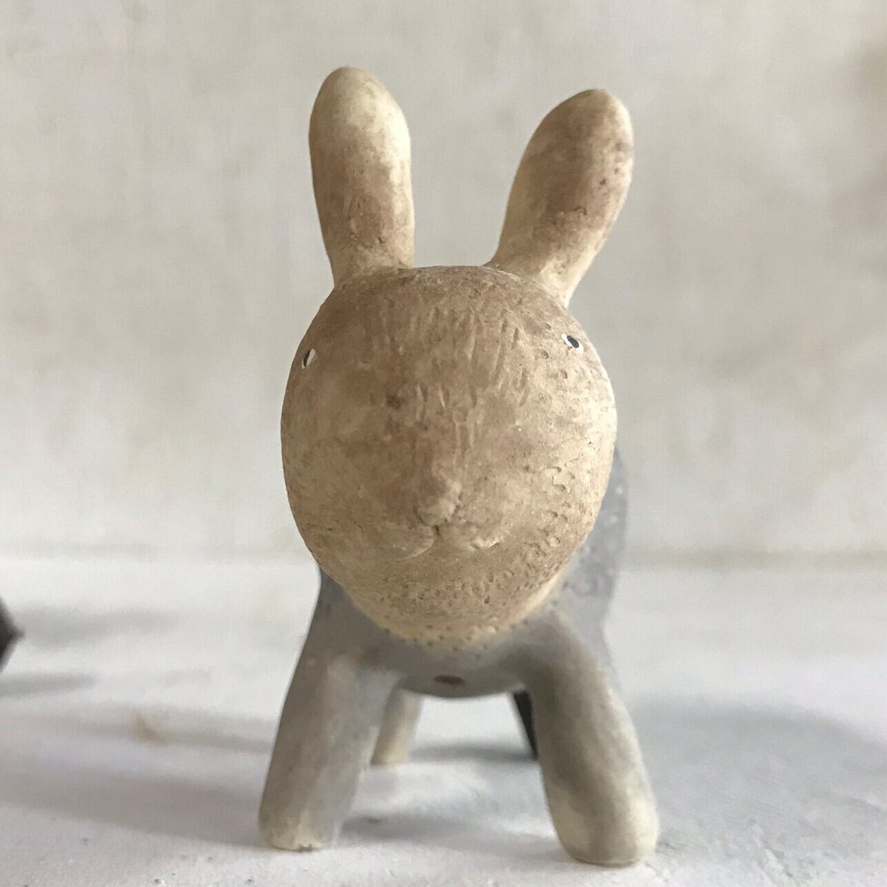 陶製のうさぎの置物です。手作りの為、1点1点 形、色などが画像と多少違いがあります。 長さ 7cm位