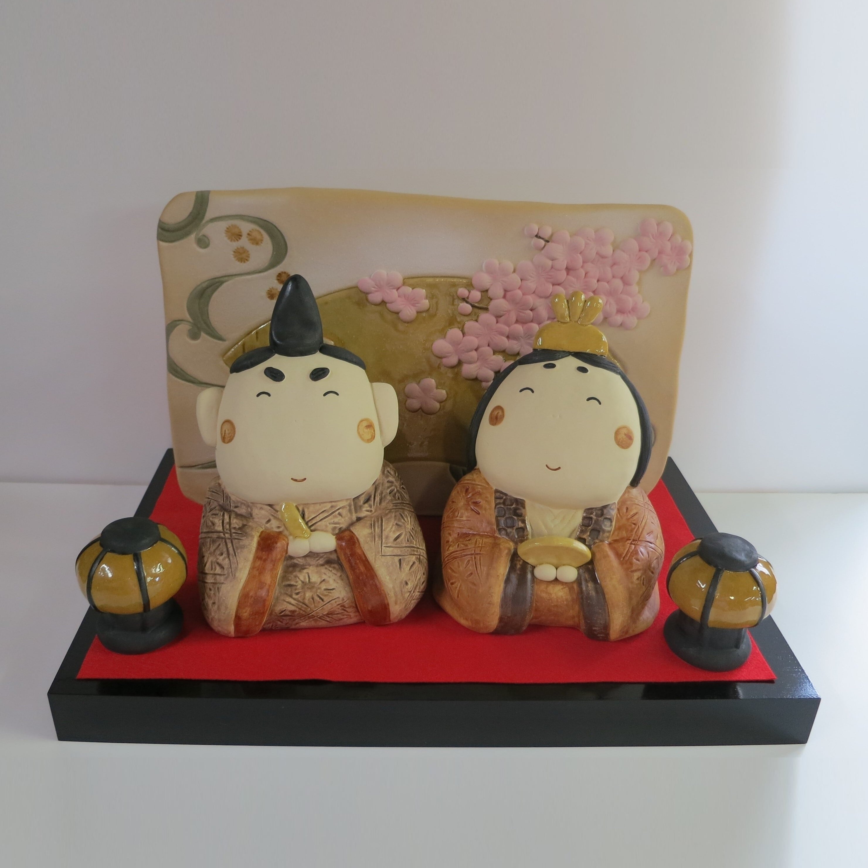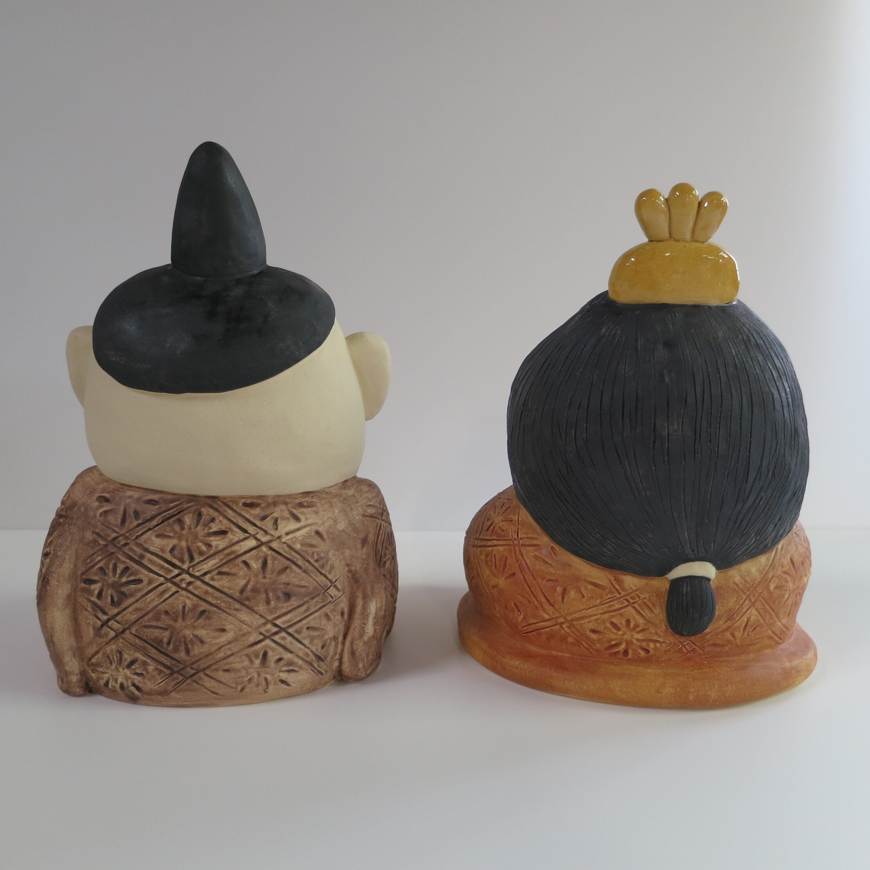 陶製の雛人形です。手作りの為、1点1点 形、色などが画像と多少違いがあります。 お内裏様、お雛様 高さ 20cm位 黒台 横48cm位×奥行32cm×高さ4cm位
