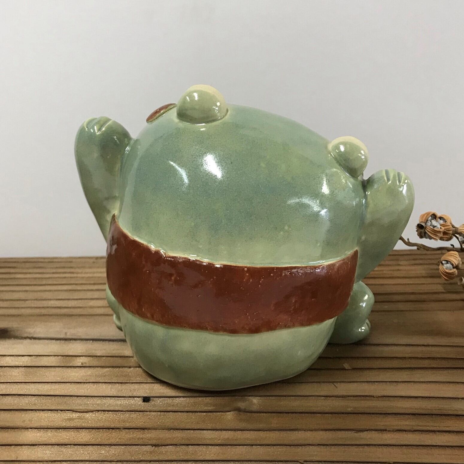 陶製のかえるの置物です。手作りの為、1点1点 形、色などが画像と多少違いがあります。