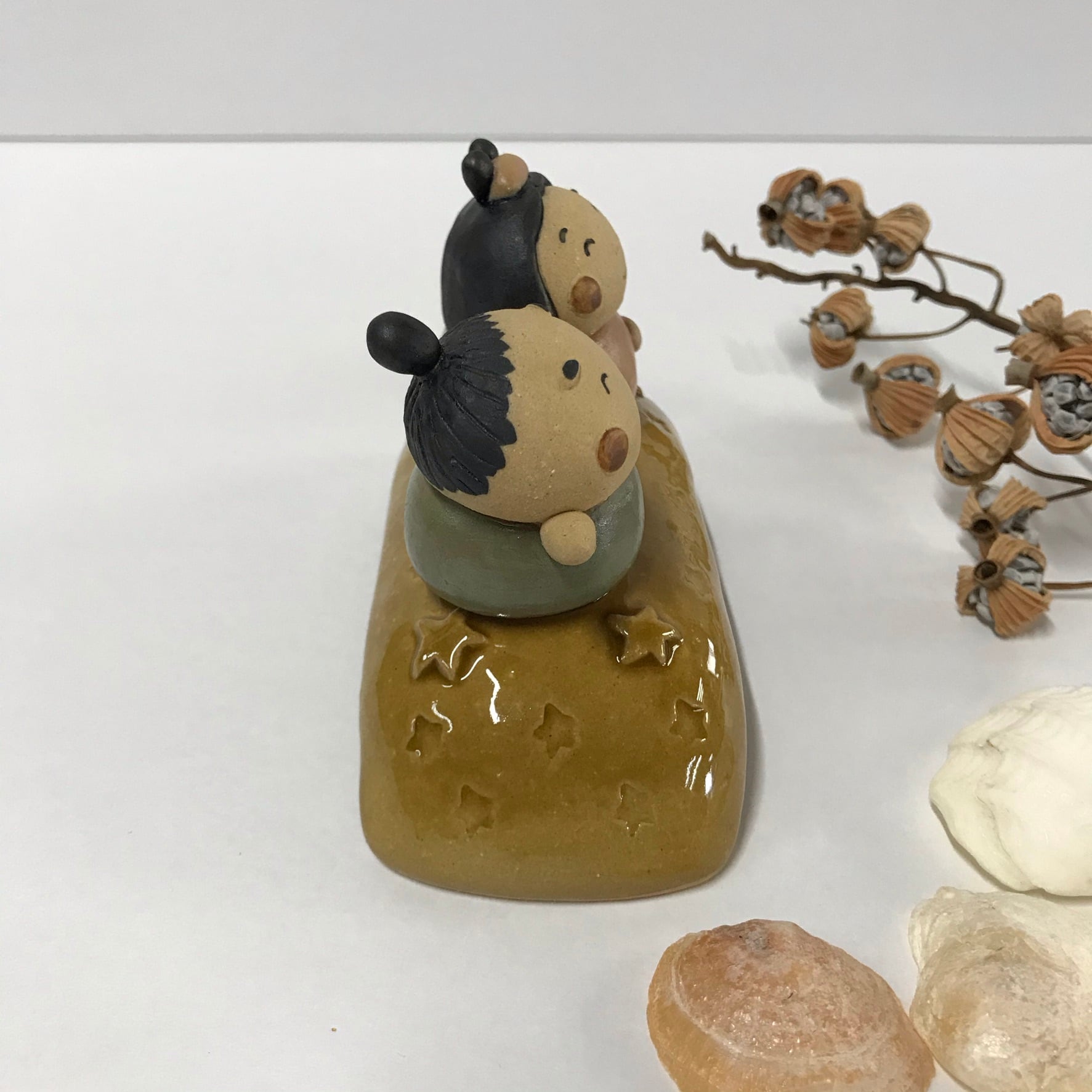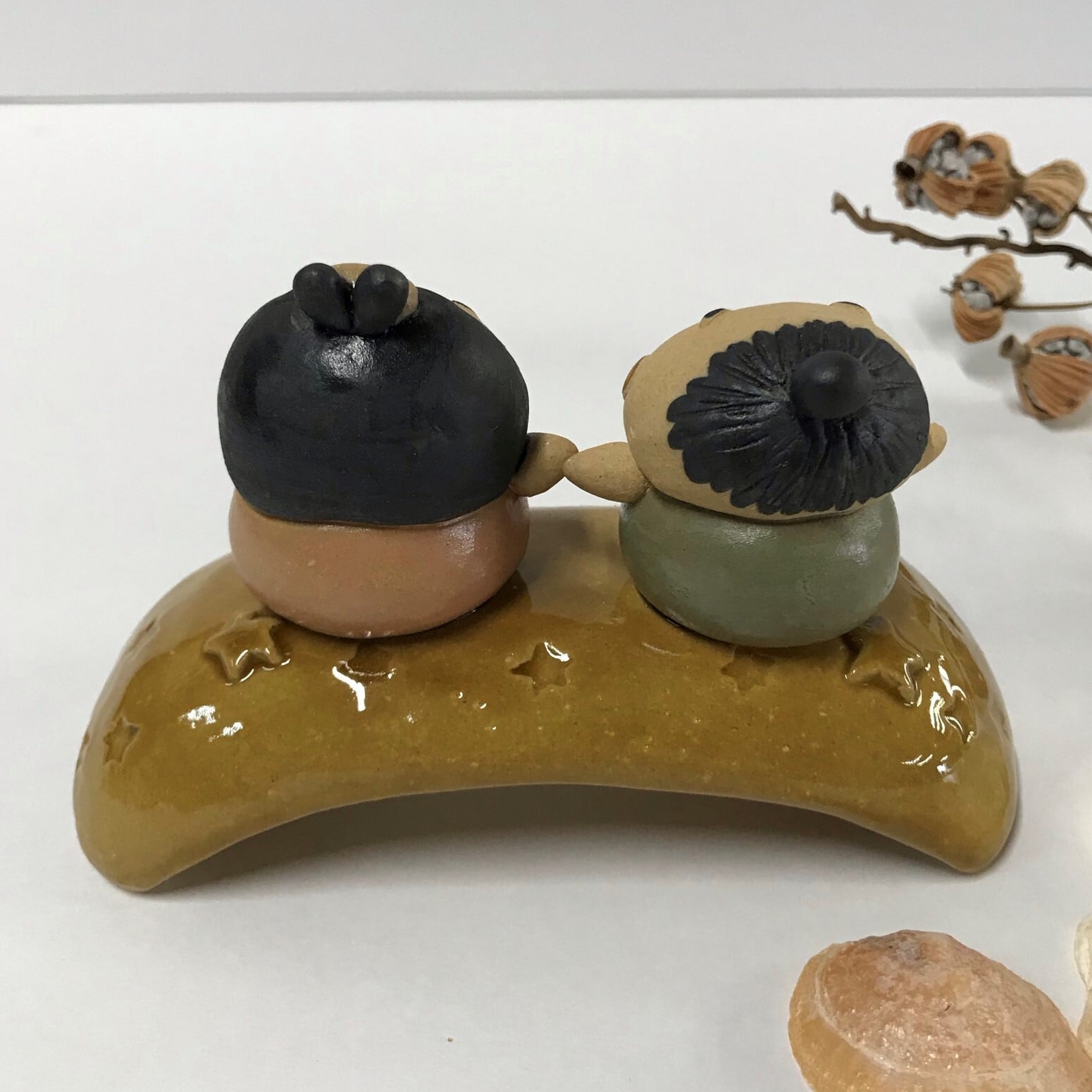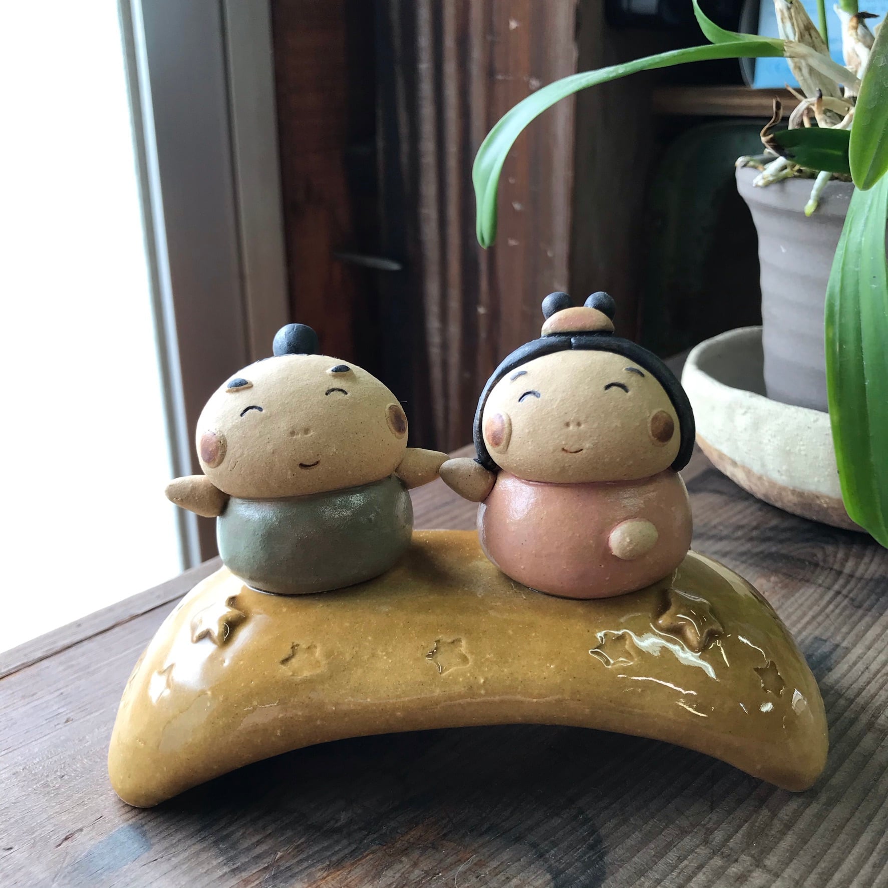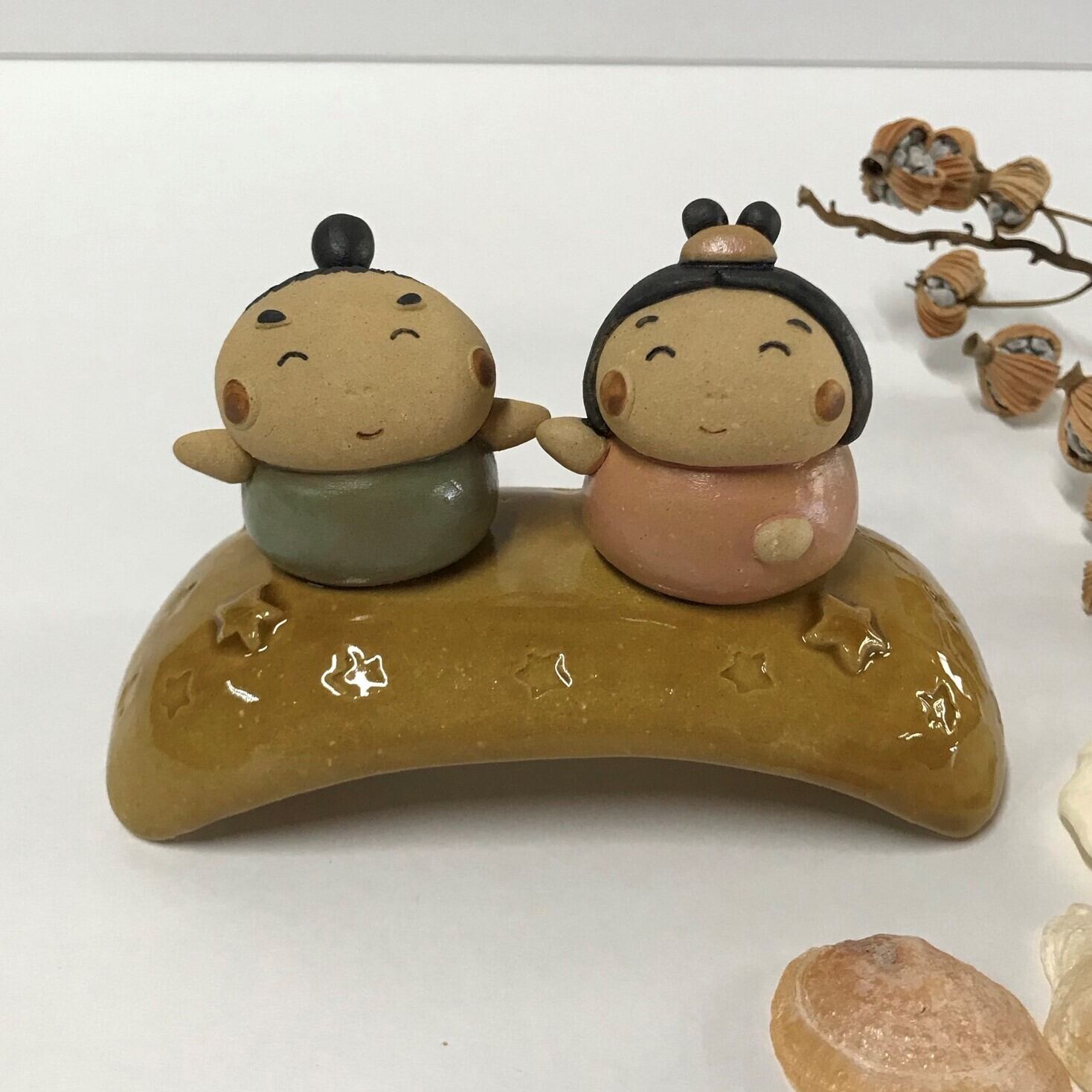 It is a ceramic Tanabata figurine. Because it is handmade, the shape and color of each item may differ slightly from the image. It was