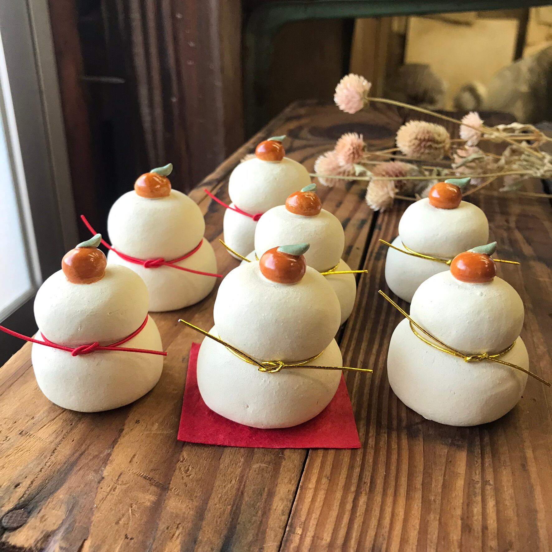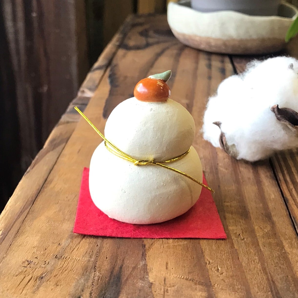 It is a figurine with a ceramic kagami mochi. Because it is handmade, the shape and color of each item may differ slightly from the image. Height 4.5 cm ~5cm