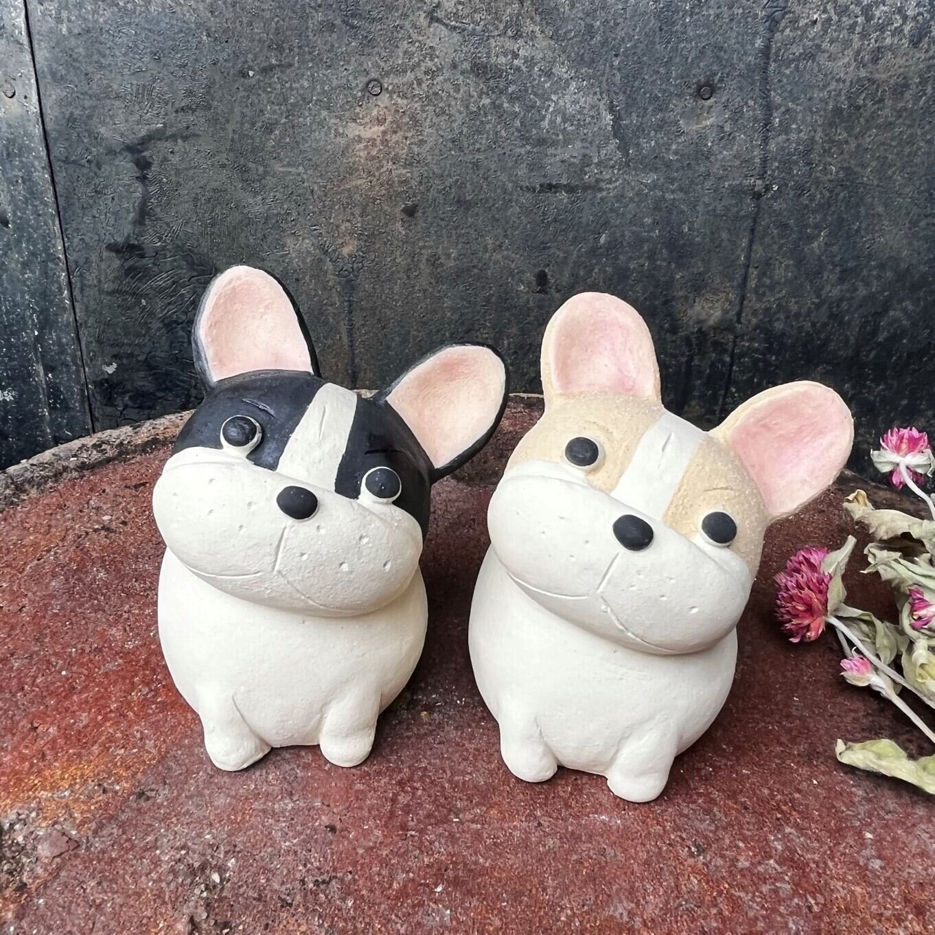 A ceramic French bulldog figurine. Because it is handmade, the shape and color of each item may differ slightly from the image. It was