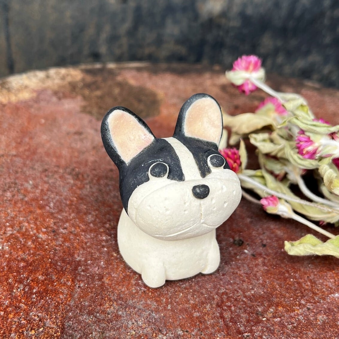 A ceramic French bulldog figurine. Because it is handmade, the shape and color of each item may differ slightly from the image. It was