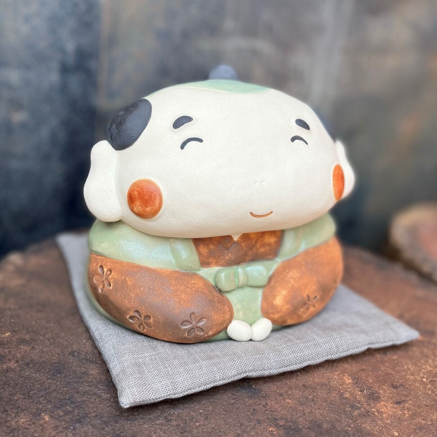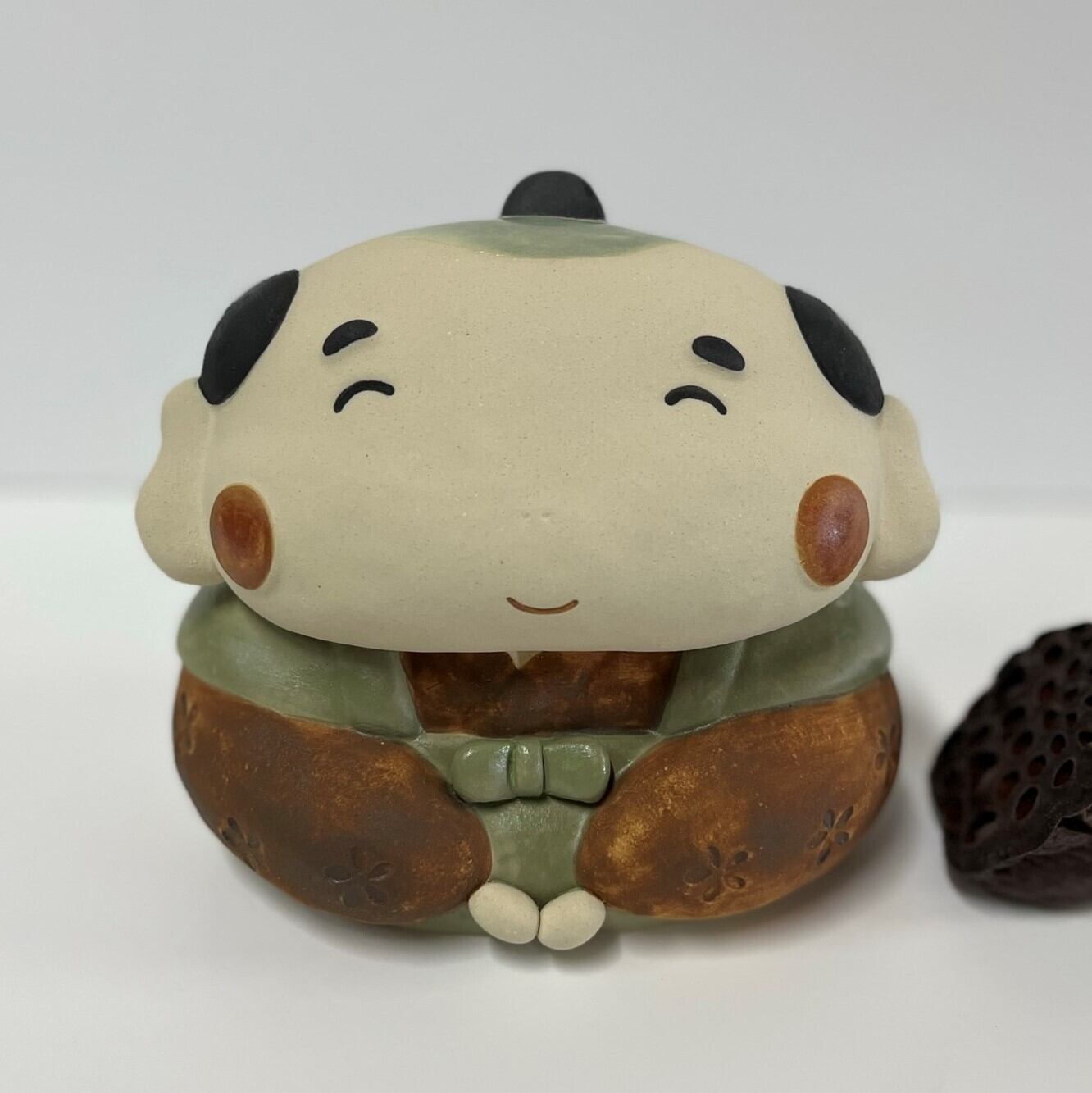 It is a ceramic figurine of Mr. Fukusuke. Because it is handmade, the shape and color of each item may differ slightly from the image. It was