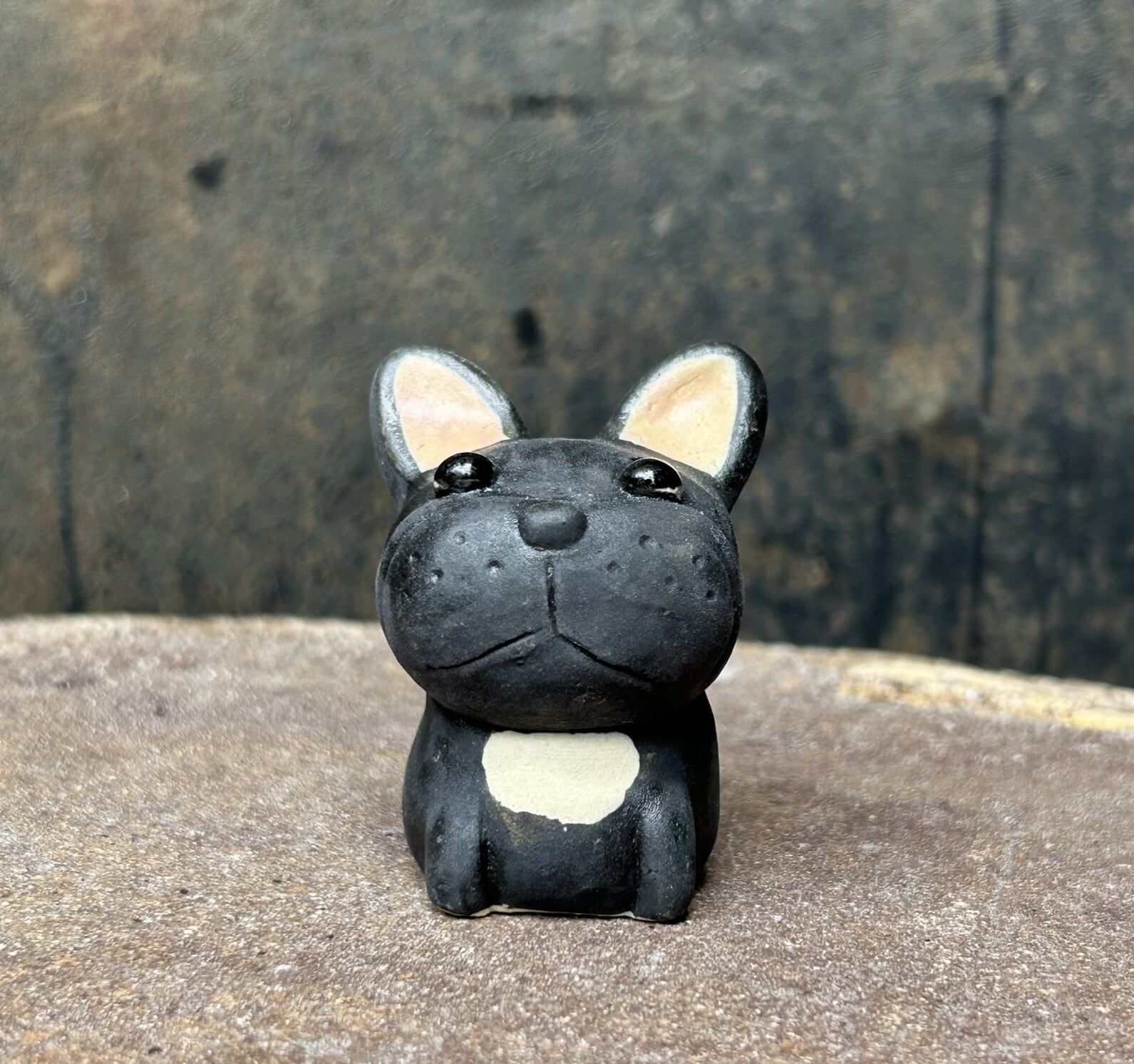 A ceramic French bulldog figurine. Because it is handmade, the shape and color of each item may differ slightly from the image. It was